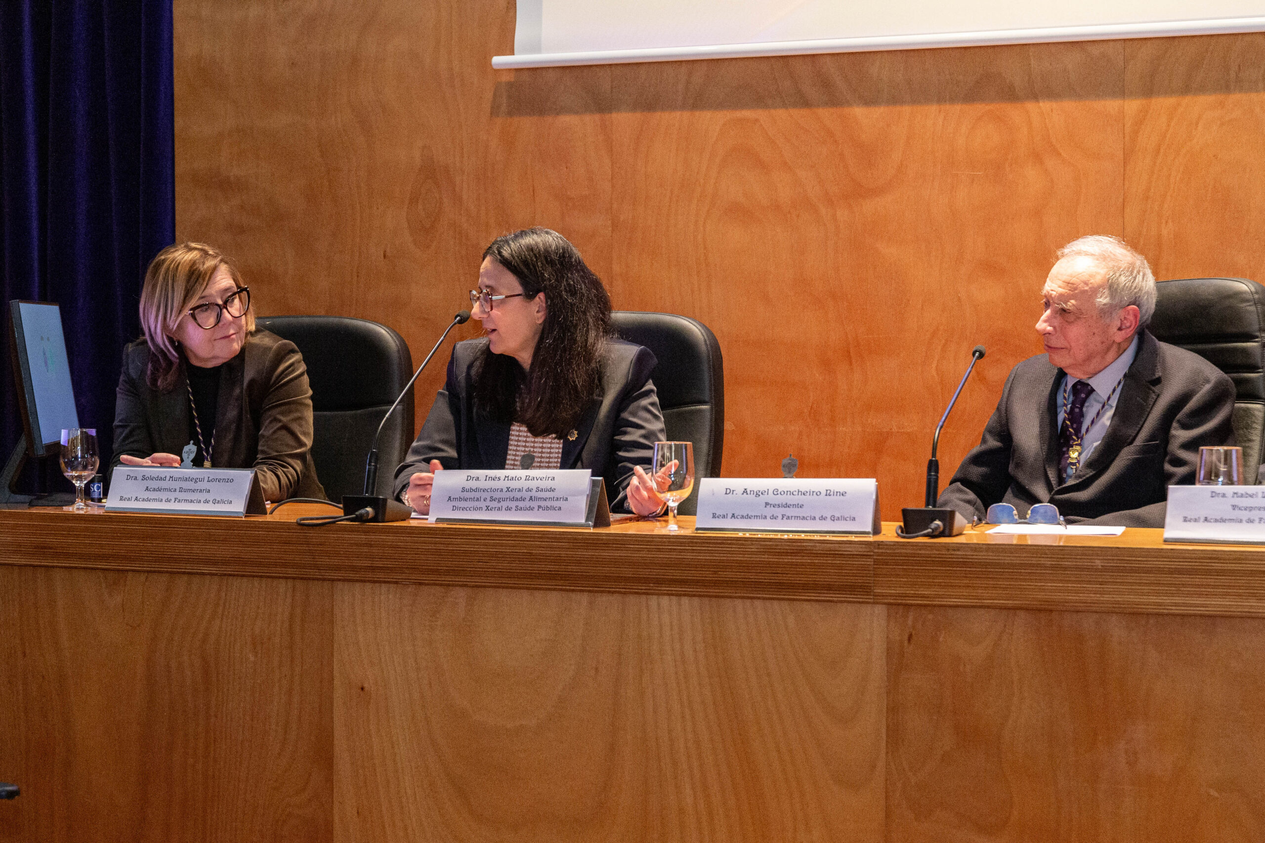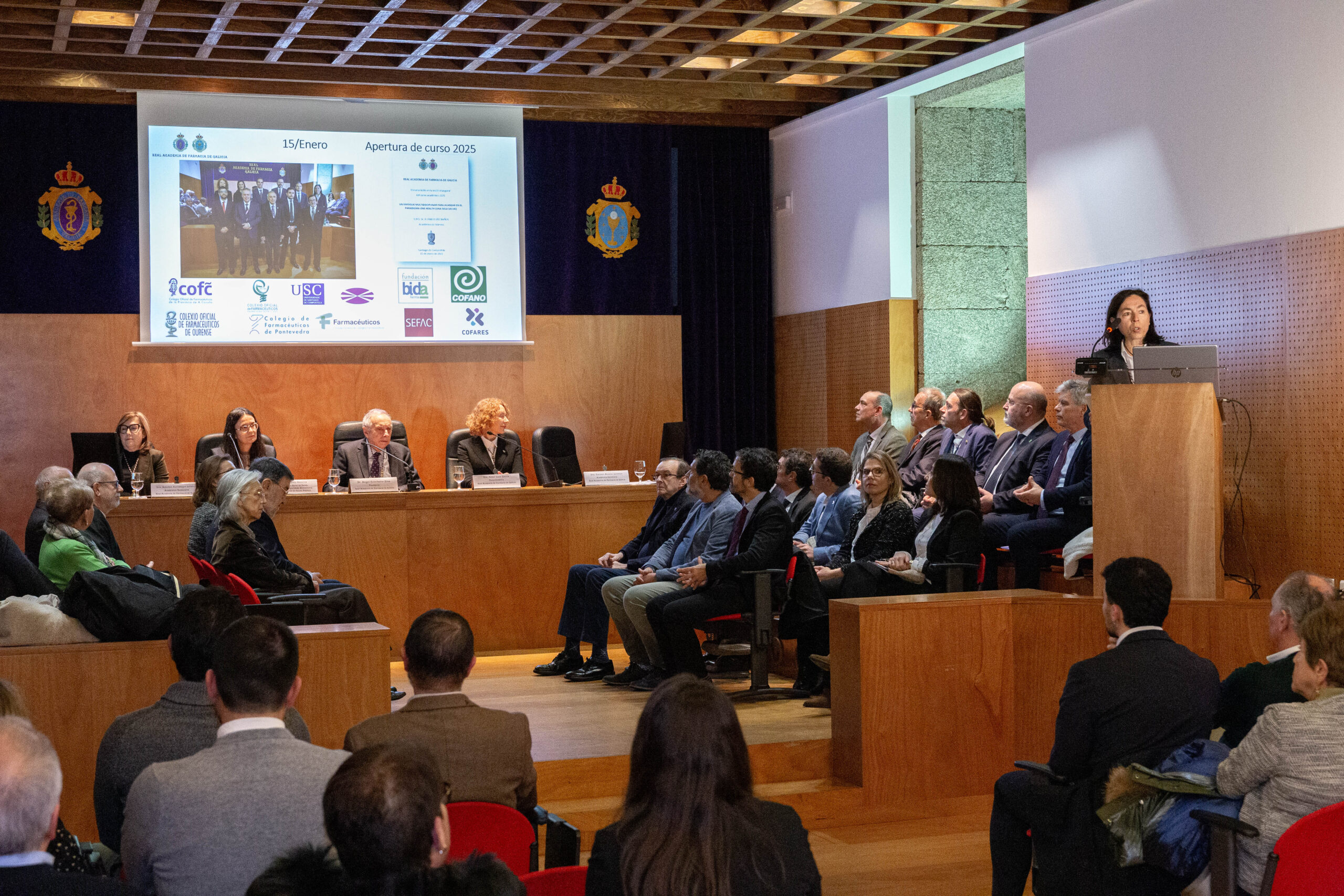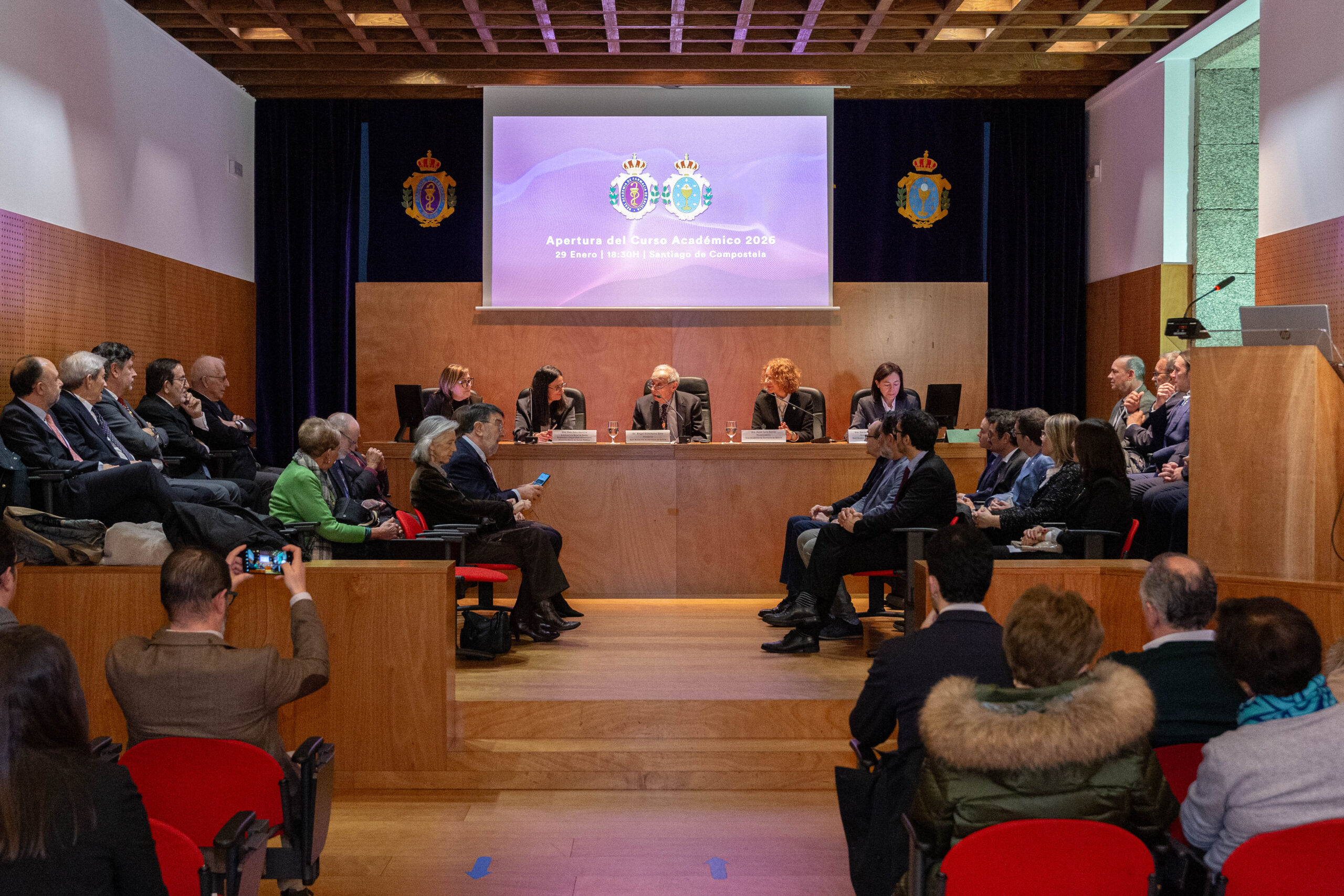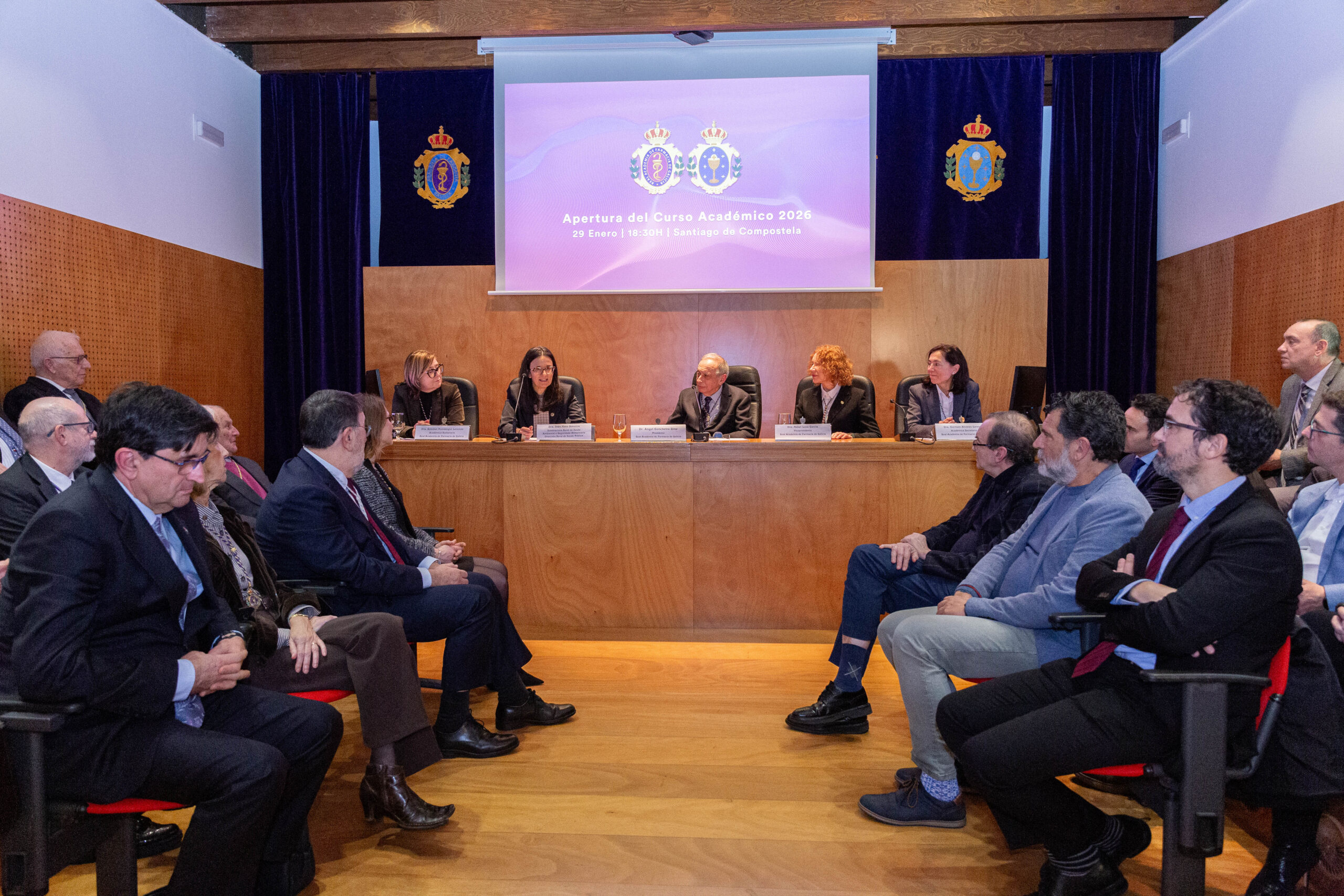 El acto contó con la presencia de la Subdirectora xeral de Saúde Ambiental e Seguridad Alimentaria da Dirección Xeral de Saúde Pública, Inés Mato Naveira, en representación do Conselleiro de Sanidade, con el Secretario Xeral de Universidades, y los cuatro presidentes de los Colegios Oficiales de Farmacéuticos de Galicia, entre otras autoridades y representantes de academias y entidades colaboradoras. Concluyó con la intervención del presidente de la Real Academia de Farmacia de Galicia, el Ilmo. Dr. D. Ángel Concheiro Nine, quien clausuró la sesión y declaró inaugurado el curso académico 2026.