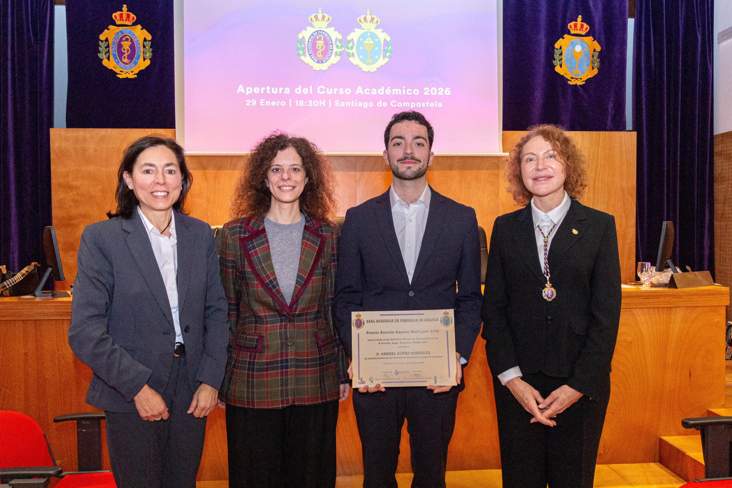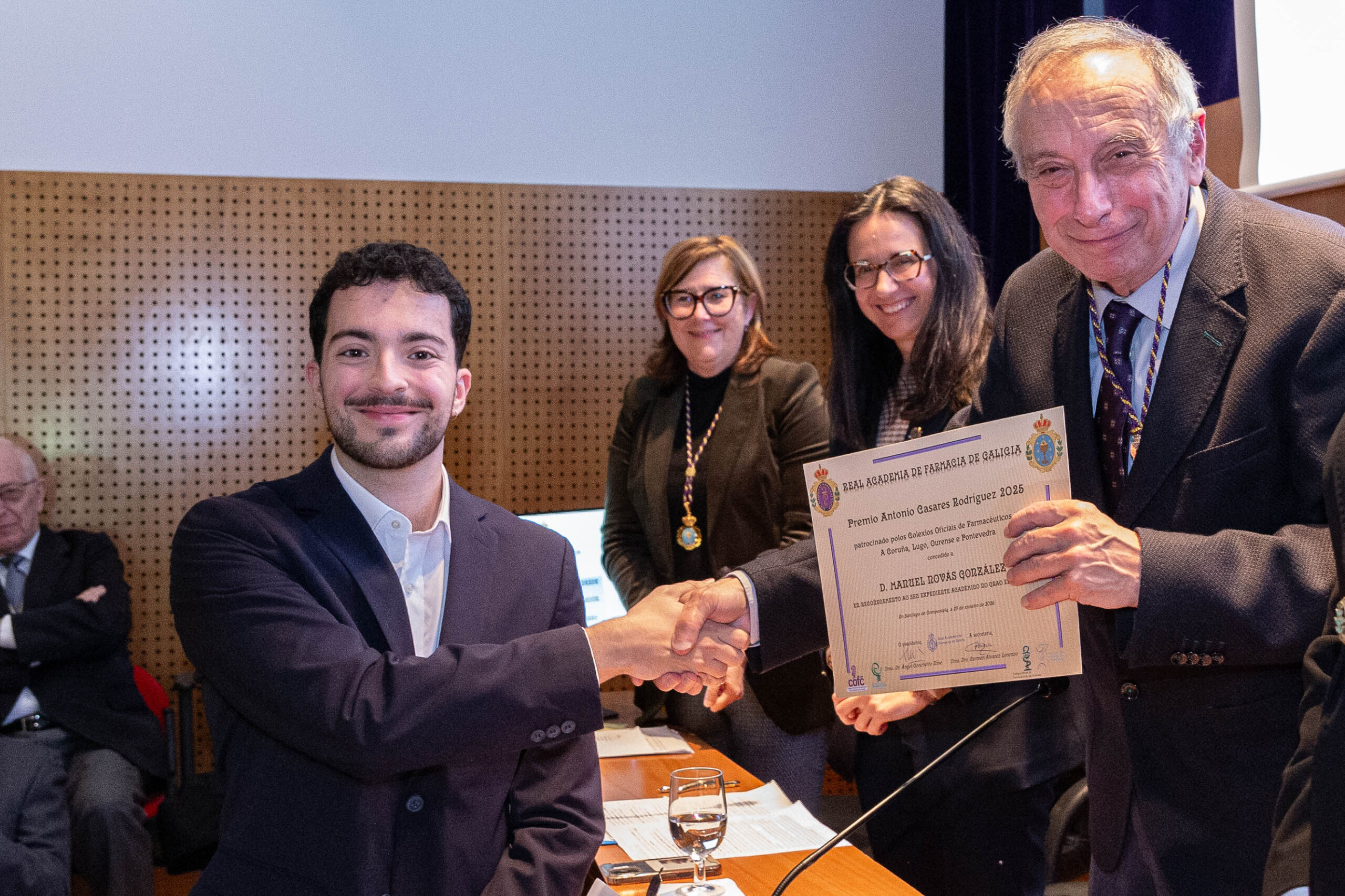 Por último, el Premio Antonio Casares Rodríguez, patrocinado por los cuatro Colegios Oficiales de Farmacéuticos de Galicia, fue concedido a Manuel Novás González, en reconocimiento a la excelencia alcanzada en sus estudios del Grado en Farmacia.