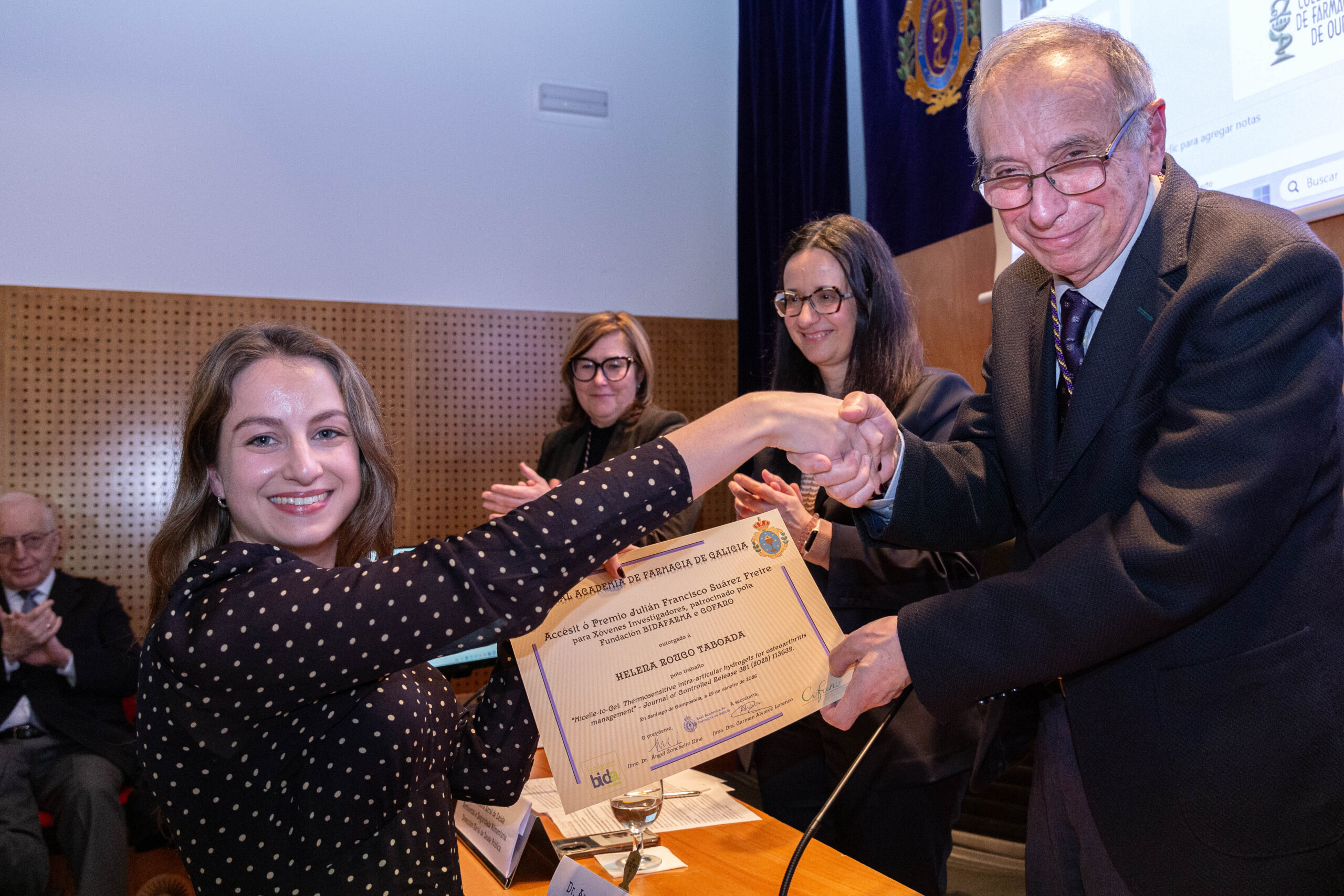 En este mismo ámbito, el jurado otorgó un accésit a Helena Rouco Taboada, del grupo I+DFarma de la Facultad de Farmacia e iMATUS, por el trabajo “Micelle-to-Gel: Thermosensitive intra-articular hydrogels for osteoartritis management”. Se trata de una propuesta innovadora frente a una enfermedad que afecta a millones de personas en todo el mundo, desarrollada mediante una colaboración multidisciplinar con participación de especialistas en traumatología del IDIS y modelos preclínicos de la Facultad de Veterinaria de Lugo.
